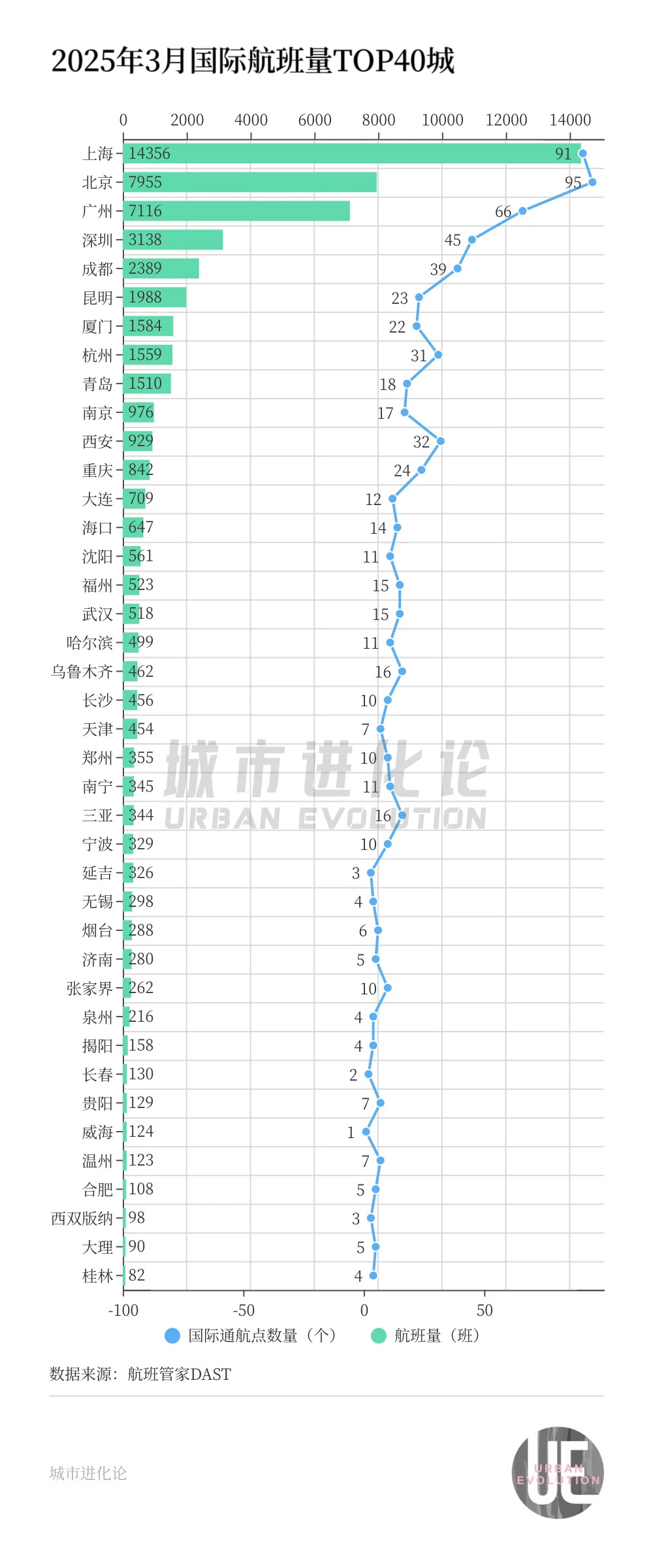 上海是国际航班量最多的城市,根据航班管家DAST提供给城市进化论的数据,2025年3月上海与91个境外机场通航,当月航班量达到1.44万班。北京、广州、深圳、成都的国际航班数量紧随其后。这5座城市也都是“即买即退”先行试点地区。